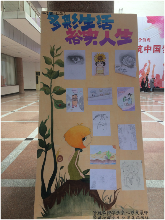 活动前期,心理发展部成员认真构思,细致策划。同学们积极报名,踊跃参与,一幅幅作品呈现眼前,抒发着同学们对生活的向往与憧憬。“生活不止眼前的苟且,还有诗和远方的田野”;“阳光很暖,微风不燥;时光不老,岁月静好”;“万物皆有生命,世间萦绕灵气,愿以心之眼寻生活之美好”等各种各样的作品从不同角度抒发着同学们对生活的向往与憧憬。活动负责人慎重评选,并将优秀作品在文经楼大厅展出,供大家欣赏感悟。